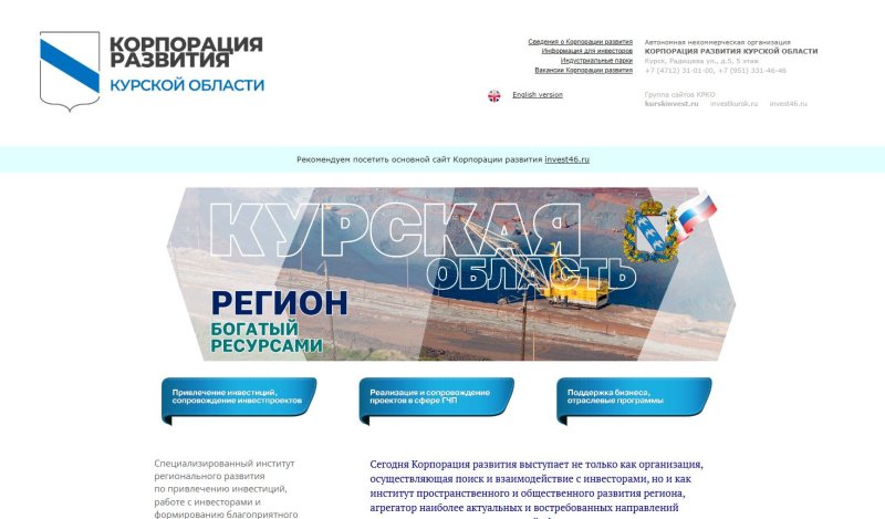 Для того, чтобы "зашедший на огонёк" пользователь не перепутал, владельцы сайта в самом верху главной страницы вывесили аншлаг "К деятельности АО "Корпорация развития Курской области" никакого отношения не имеем!". Однако, перелицовки содержания страниц нового сайта почти не произошло. Слово "бизнес" в большинстве случаев в тексты не добавлено.