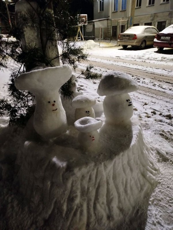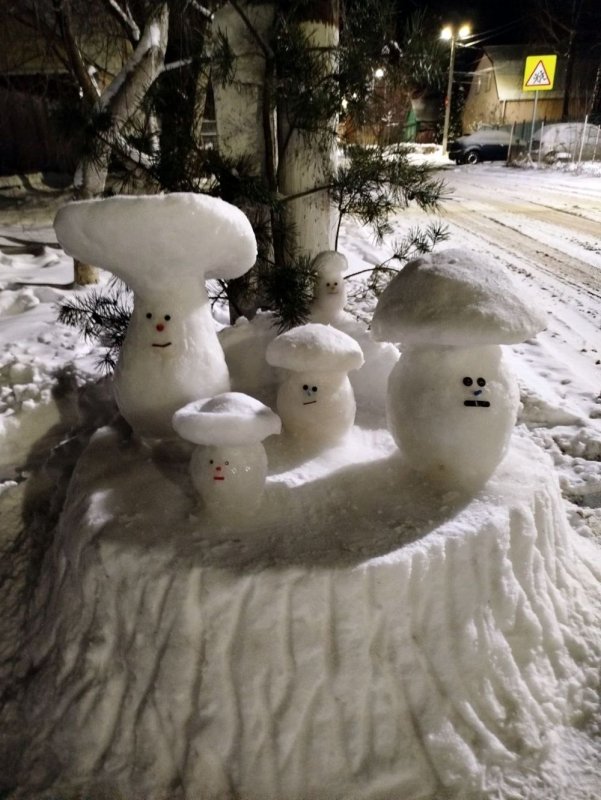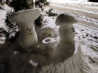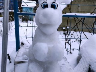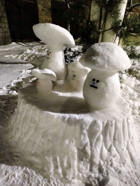 В этом году на придомовой территории и приусадебном участке фатежский снежных дел мастер решил изваять целую грибную семейку. Потом понял, пока позволяет погода, нужно действовать. Так, буквально за один вечер появились величественная, но в то же время кокетливая Снежная королева в широкополой дамской шляпе и задорный, но весьма внушительный по габаритам Заяц.