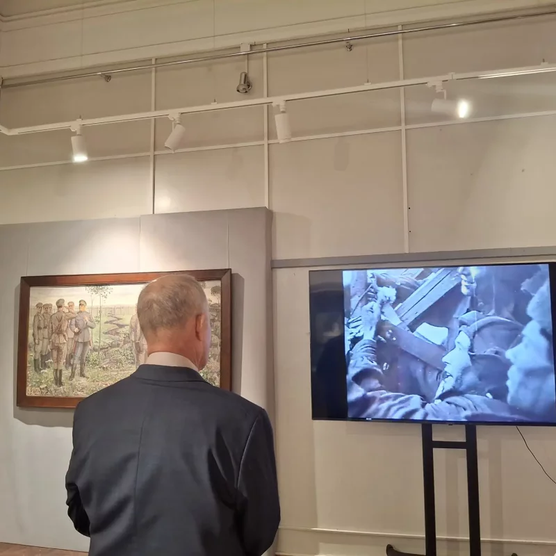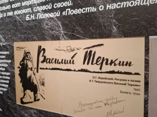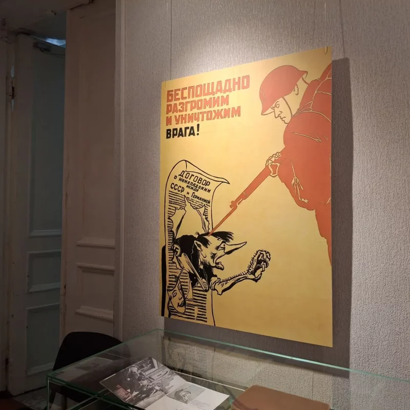 Безмолвным доказательством её слов служит огромным плакат, расположенный во фронтальной экспозиционной зоне - "Родина-мать зовет!" Ираклия Моисеевича Тоидзе. На смежной стене - не менее известный плакат графиков Кукрыниксов "Беспощадно разгромим и уничтожим врага".