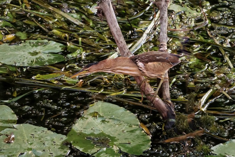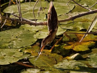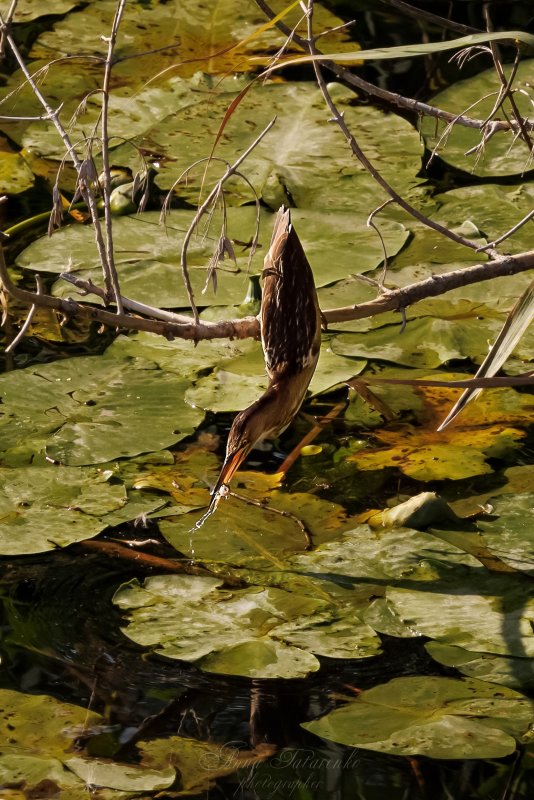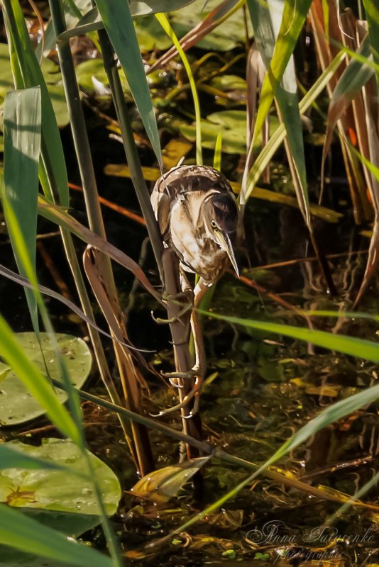 - Небольшое полосатое бежевое яйцо с длинными серо-зелёными лапами растянулось меж стеблей рогоза, - рассказывает Анна. - Странная птица абсолютно неподвижно испытывала моё терпение и любопытство минут 15, когда случилось новое чудо: оказывается, у этого яйца с лапками есть телескопическая молниеносно вытягивающаяся шея с длиннющим клювом!