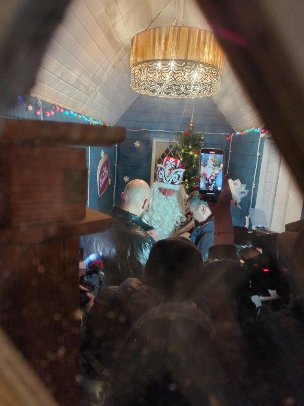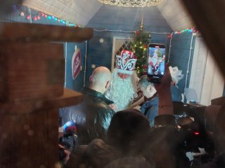 Главный новогодний символ - украшенную огромными переливающимися шарами, сверкающими гирляндами и декоративными хрустальными снежинками - елку зажег, как и полагается, сказочный Дед Мороз. После этого ему предстояло занять свое "рабочее" место. Как только новогодний исполнитель чудес вошел в приемную, к нему выстроилась первая очередь. Дедушка Мороз сразу же начал принимать гостей,