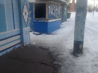 В качестве подтверждения - фотографии, сделанные у остановочного пункта. На дороге - ледяная колея, у дороги - обшарпанные пустые киоски с мусором и валяющиеся на земле автомобильные покрышки.