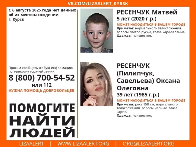 В Курске поисковый отряд "Лиза Алерт" запросил помощи добровольцев в поисках пропавшей семьи - 5-летнего ребенка и его матери 39-летней Оксаны Ресенчук.