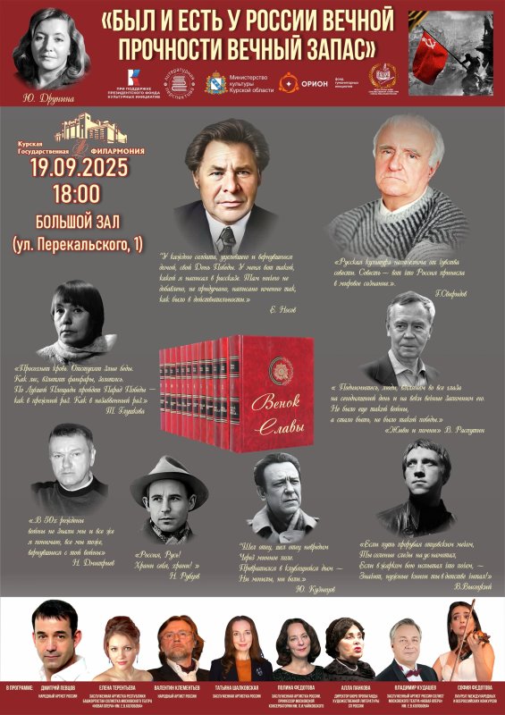 В пятницу, 19 сентября, в 18:00 в Курской государственной филармонии дадут литературно-музыкальный концерт-спектакль «Был и есть у России вечной прочности вечный запас» с участием народных артистов России Дмитрия Певцова и Валентина Клементьева.