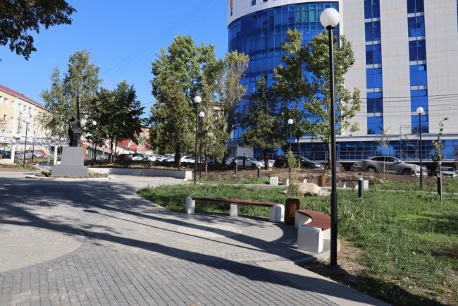 На этом участке города параллельно с благоустройством сквера обновили еще и обшарпанные фасады зданий, расположенных на углу Радищева и Дзержинского. Теперь вся территория выглядит гораздо более свежо и опрятно.