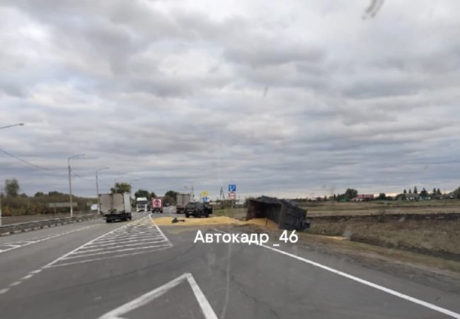 В Курской области в Щигровском районе на участке дороги у поворота на Касторное перевернулась фура с зерном.
