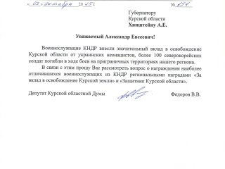 - Более 100 северокорейских солдат погибли в ходе боев на приграничных территориях Курской области, - напоминает депутат и в связи с этим обращается к главе региона с предложением о награждении наиболее отличившихся военнослужащих из КНДР региональными наградами «За вклад в освобождение Курской земли» и «Защитник Курской области».