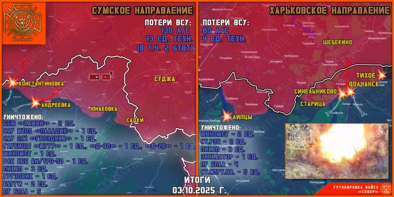 По информации сводки военкоров телеграм-канала «Северный Ветер» на утро 4 октября, боевики ВСУ пытались провести обманный маневр, чтобы прорвать курскую границу в районе Константиновки.
