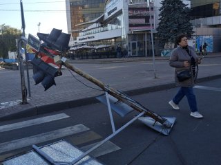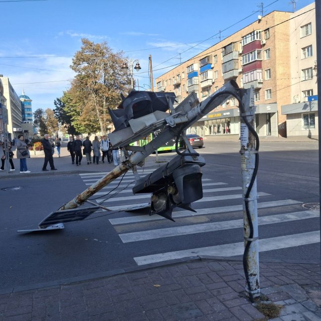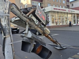 В социальных сетях расходятся кадры «усталого» светофора. Объект упал на дорогу и тротуар на улице Садовой.