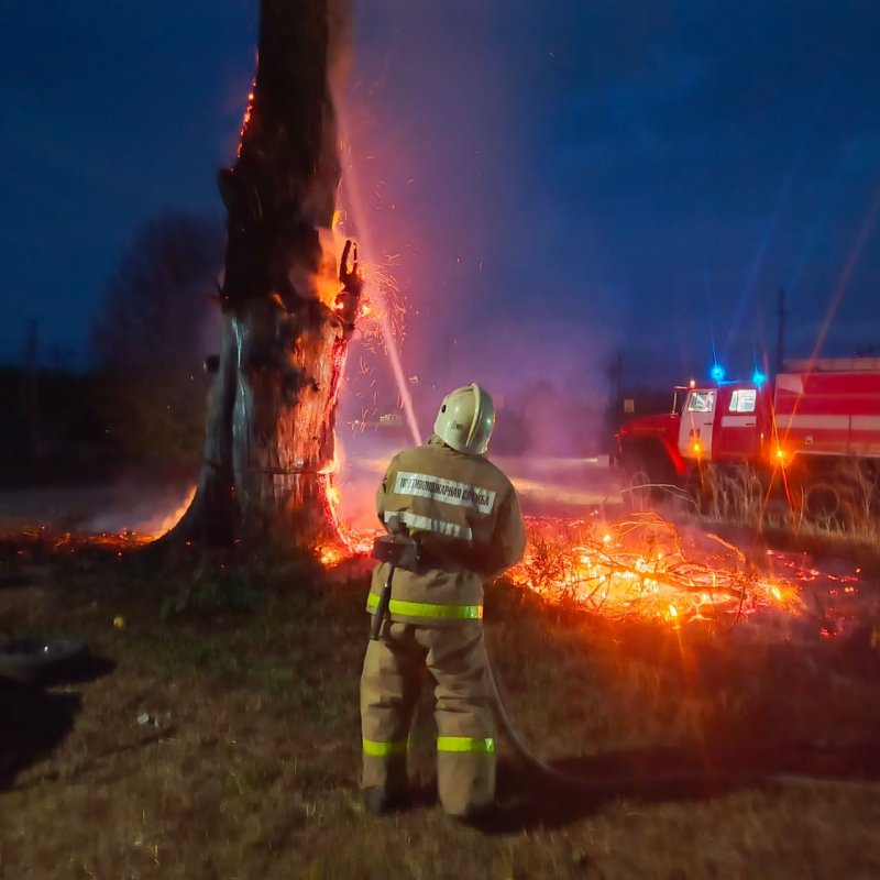 Фотография тушения получилась эпичной. Пылающее в ночи дерево оперативно погасили с помощью ствола "Б".