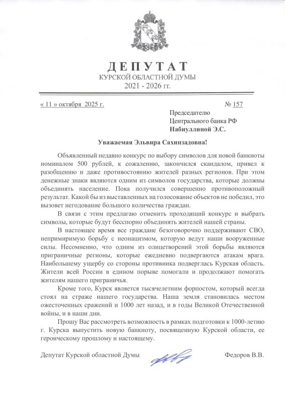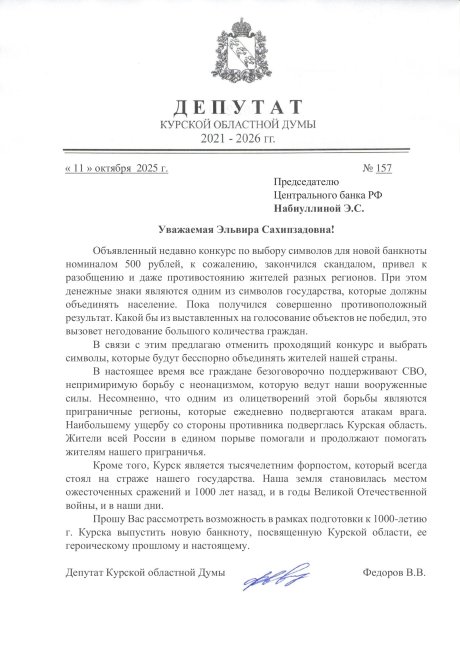 Депутат Курской областной Думы Владимир Фёдоров внес своё предложение по поводу громкого скандала, разразившегося в связи голосованием по выбору символов, которые должны будут украсить новую 500-рублёвую купюру.