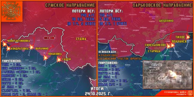 По информации военкоров телеграм-канала «Северный Ветер» на утро 25 октября, опасаясь продвижения войск северной группировки РФ, киевское командование перебрасывает подразделения БПЛА ВСУ в Сумскую область.