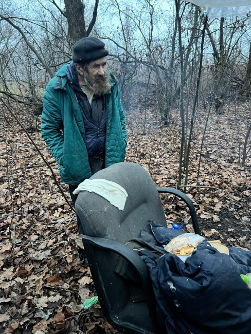 Волонтерская организация «Домик добрых дел» по сообщению жителей выехала за город, чтобы найти бездомного пожилого мужчину и помочь ему. Он проживает в лесополосе. Ему 74 года.