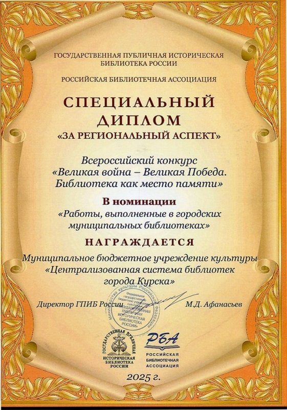 Библиотека представила проект «#Курск-Донбасс_ побратимы истории». Он получил специальный диплом «За региональный аспект» в номинации «Работы, выполненные в городских муниципальных библиотеках».