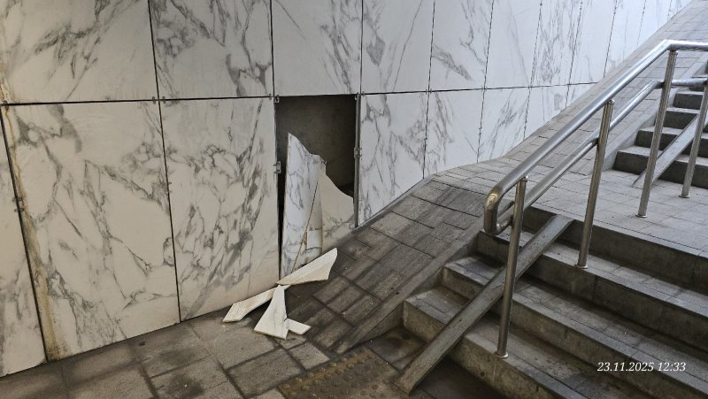 Жительница Анастасия Береговая рассказала в социальных сетях о повреждении облицовочной плитки в подземном переходе на остановке «Налоговая». Она просит городские власти установить личности вандалов, ведь здесь имеются камеры видеонаблюдения.