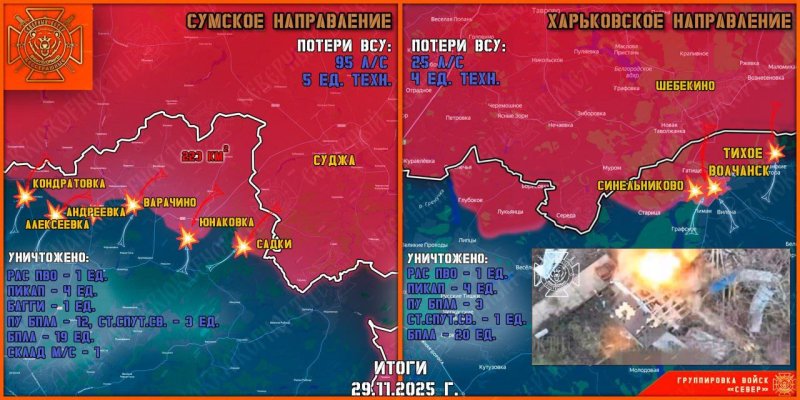 Опубликована сводка о положении дел на утро 29 ноября. Телеграм-канал «Северный Ветер» сообщает, что на всем участке фронта курско-сумского направления продолжаются ожесточенные бои. В районе села Песковка Сумской области произошел взрыв крупного склада боеприпасов для ВСУ. По информации военкоров, есть погибшие среди военных ВСУ, которые обслуживали склад.