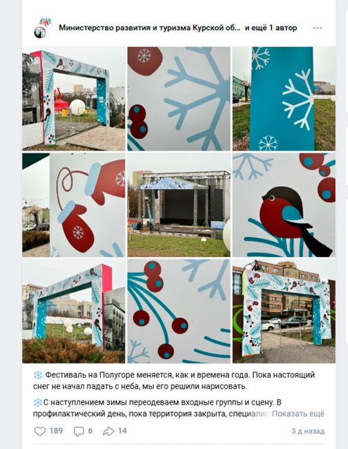 Страница ВКонтакте вполне "живая", там все время размещаются различные посты. Например, про зимний фестиваль на Полугоре или про новый режим работы подсветки на Мемориальном комплексе «Курская битва». При этом у курян создается впечатление, что Министерство приоритетных проектов развития территорий и туризма Курской области до сих пор существует. Параллельно ведется и официальный аккаунт расформированного министерства в Телеграм.