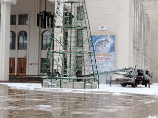 В Курске продолжается установка главной городской новогодней ёлки на Театральной площади. Сегодняшний снегопад работам не помешал. Утром на площадь вновь прибыла спецтенхика.