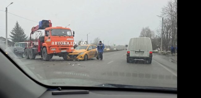 Сегодня в начале девятого утра в деревне Рассыльной Курского района не поделили проезжую часть автомобили "КамАЗ" и "Хендай Солярис" в характерных для такси цветах.