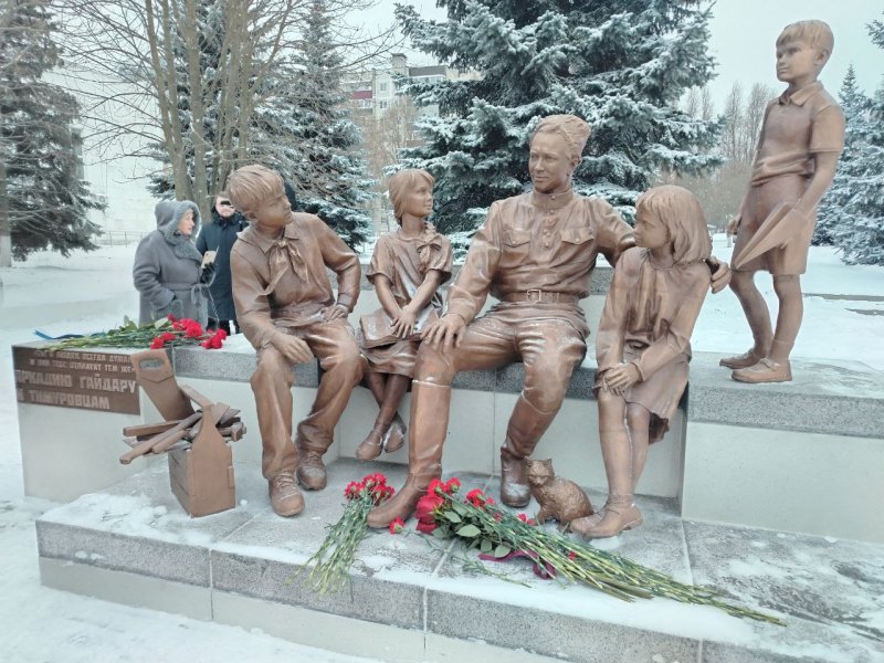 Сегодня в Курске. невзирая на сильный снегопад, провели церемонию торжественного открытия памятника Гайдару и тимуровцам. Эту скульптурную композицию разместили у городского молодёжного центра «Гелиос» на улице 50 лет Октября.