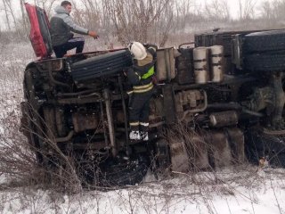 Около полудня на автодороге "Курск - Солнечный" ушёл в кювет большегрузный автомобиль с прицепом. Съехав за обочину, большегруз перевернулся на бок.
