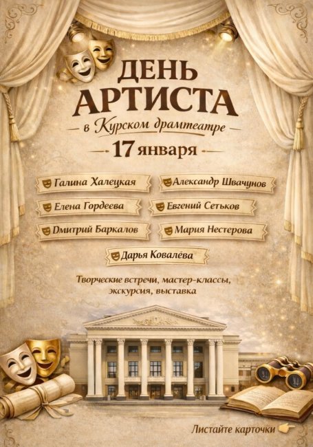 Творческие встречи с лауреатами премии «Спасибо» в номинации «Артист года», мастер-классы, экскурсии и выставка. Курский драматический театр имени Александра Пушкина с размахом отметит День артиста. Этот праздник 17 января в России отметят впервые.