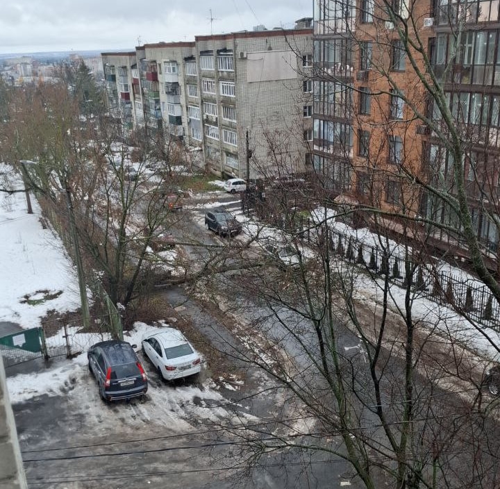 В Курске сегодняшнее утром стало недобрым для жителей улицы Халтурина. Там у дома №8 упали столб и дерево. Они рухнули не только на дорогу, но и на припаркованные автомобили.