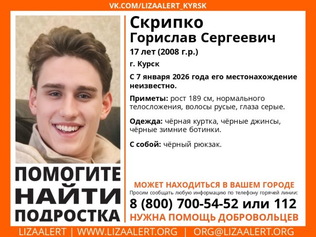 - В Курске пропал 17-летний Горислав Скрипко, - пояснили добровольцы. - С 7 января 2026 года его местонахождение неизвестно.