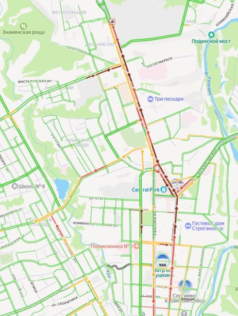 Поток автомобилей, стремящихся проехать по улице Карла Маркса около полшестого вечера, остановился из-за двух ДТП. Одно из них произошло в районе медуниверситета, второе затормозило поток машин на Дальних парках.