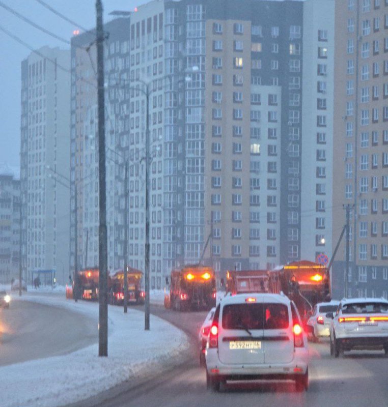 Активно трудятся пескоразбрасыватели, бульдозеры и роторные снегоуборочные машины.