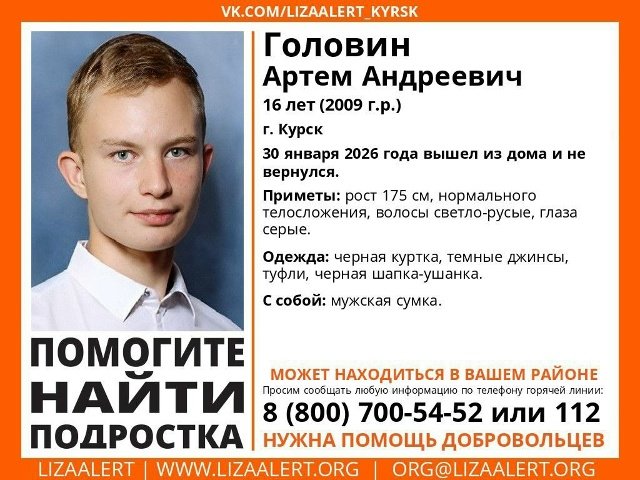 Поисковый отряд «ЛизаАлерт» объявил розыск 16-летнего Головина Артема Андреевича. Он ушел из дома вчера, 30 января, до сих пор не вернулся.