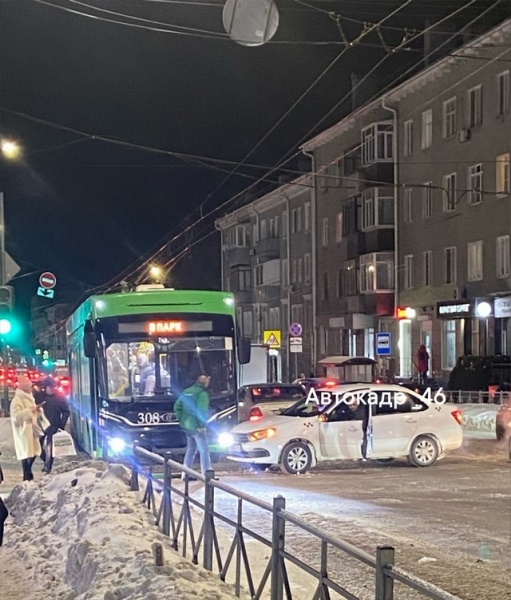 Центре Курска вновь зафиксирована авария с участием троллейбуса. ДТП случилось сегодня, 9 февраля, вечернее время.
