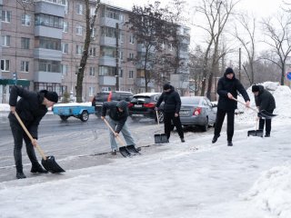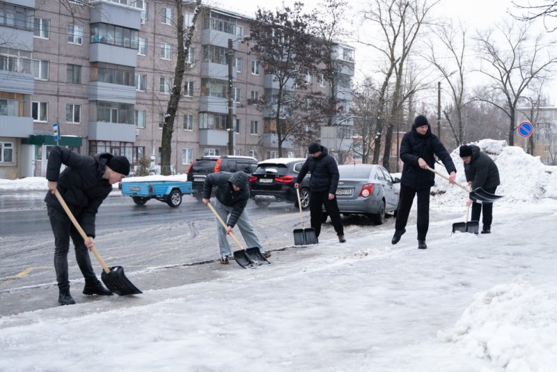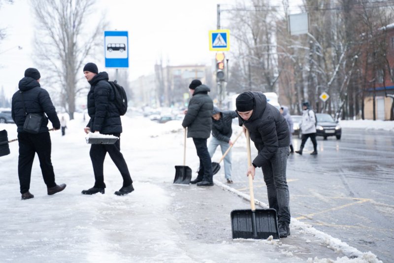 Юноши вооружились лопатами и стали расчищать главные пешеходные маршруты кампуса.