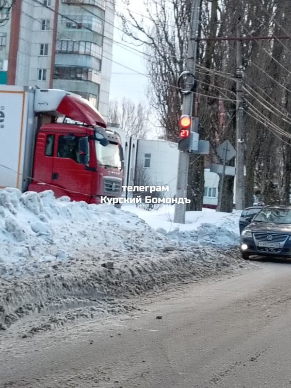 Жители Курска 20 февраля пожаловались в социальных сетях на застрявшую с 12:00 фуру крупного сетевого магазина. Курян беспокоят возможные последствия такой стихийной статичности габаритного транспортного средства - при гипотетическом ЧП в ближайших многоэтажках или образовательном учреждении спецтехника не сможет подъехать к источнику опасности.