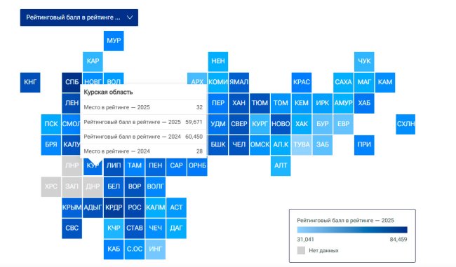 В 2024 году Курская область занимала в рейтинге качества жизни 28 место. В 2025 году - 32 место. А в 2023 году у региона и вовсе была 24 позиция. То есть за 2 года - "минус 8" позиций.