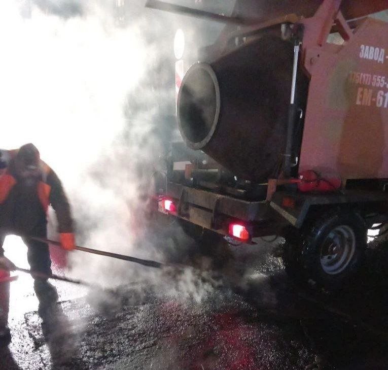 Сначала рабочие отфрезеровали ямы, а потом очистили их и уложили новый асфальт.
