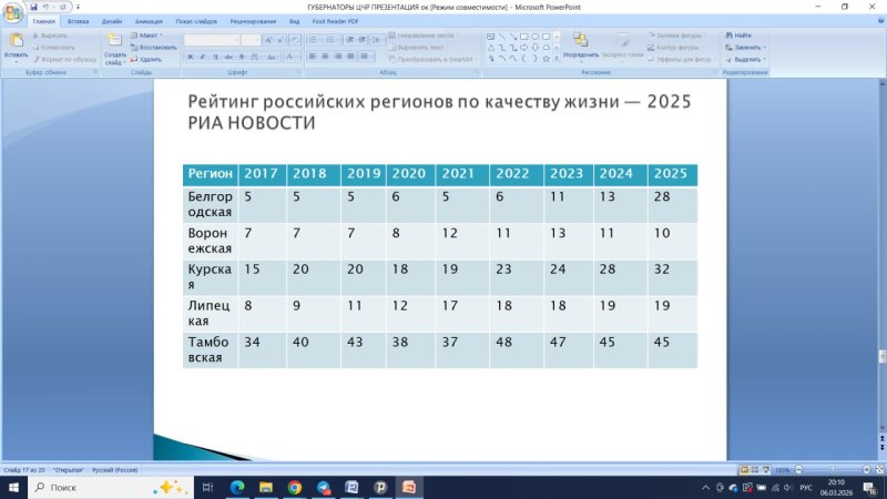 - Чернозёмные губернаторы-"тяжеловесы" на старте массовых ротаций оставляли свои регионы в весьма приличном состоянии, - отметил Владжимир Слатинов. - Белгородская область была одной из лучших в стране, Воронежская и Липецкая отставали ненамного, куряне располагались в более чем крепких «середняках». Сменившие их представители «новой волны» управляли по-разному – кто-то удерживал позиции, в большинстве случаев агрегированный показатель рейтинга падал.