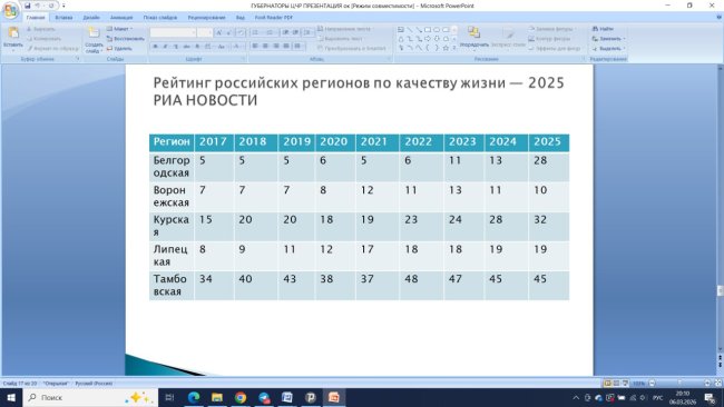 В 2024 году Курская область занимала в рейтинге качества жизни 28 место. В 2025 году - 32 место. А в 2023 году у региона и вовсе была 24 позиция. То есть за 2 года - "минус 8" позиций. В Белгородской области уровень жизни упал с 13 на 28 место, в Орловской - с 36 на 42, в Брянской - с 42 на 48.