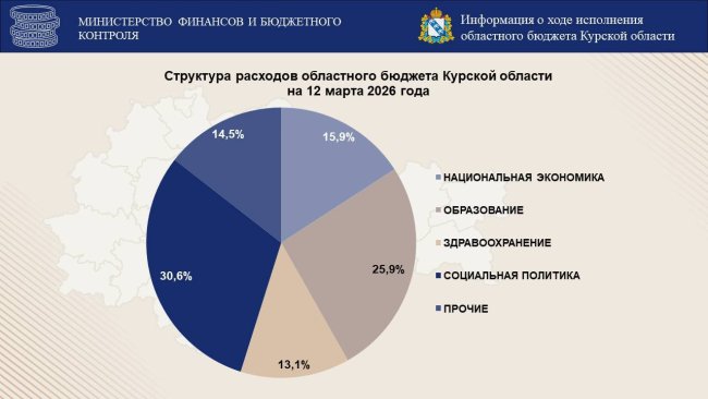 - Наибольший удельный вес в расходах областного бюджета Курской области на 12 марта 2026 года имеют средства, выделяемые на социальную политику, - пояснили специалисты. - Расходы составляют 30,6 % от всей казны.
