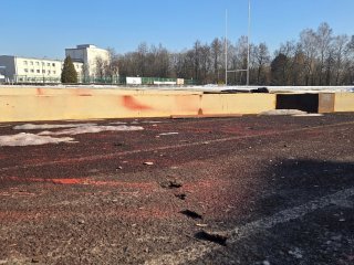 Причина порчи - ремонт стадиона. На беговых дорожках сегодня стоит тяжелая техника, рядом массивные балки. Судя по всему, они повредили прорезиненное полотно.