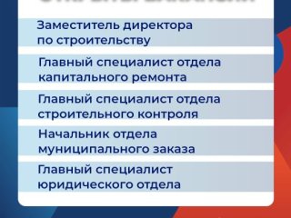 Требуются: заместитель директора по строительству – зарплата от 86 000 до 92 000 рублей; главный специалист отдела капитального ремонта – от 57 000 до 63 000 рублей; главный специалист отдела строительного контроля – от 57 000 до 63 000 рублей; начальник отдела муниципального заказа – от 68 000 до 74 000 рублей; главный специалист юридического отдела – от 51 000 до 56 000 рублей.