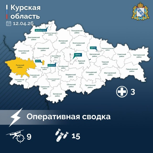 Губернатор Курской области Александр Хинштейн в сводке об оперативной обстановке в регионе за прошедшие сутки сообщил, что всего в период с 09:00 11 апреля до 07:00 12 апреля ликвидировано девять вражеских беспилотников.