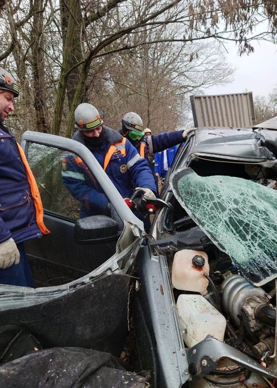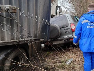 Тяжелогружёный дальнобойный тягач с прицепом сошёл с проезжей части дороги и буквально выдавил на обочину автомобиль "Нива". Удар "дальнобоя" о "Ниву" был настолько мощным, что внедорожник оказался буквально размазанным. Тела двух находившихся во внедорожнике мужчин спасателям пришлось извлекать из салона машины при помощи специнструмента.