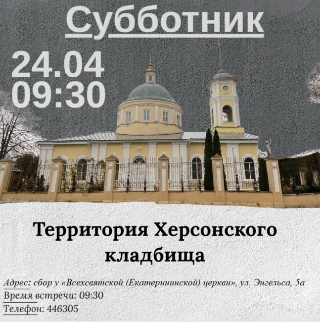 В пятницу, 24 апреля, в 9:30 на Херсонском кладбище в Курске состоится субботник. Эта информация поступила от Управления по государственной охране объектов культурного наследия Курской области.