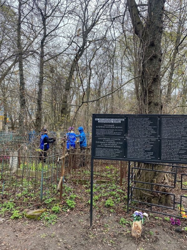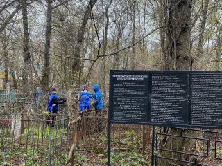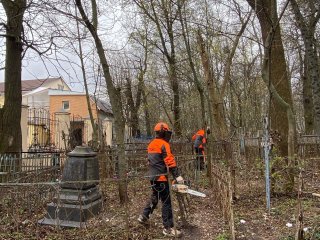Работы на кладбище запланированы на весь тёплый сезон года, а сегодня уборку начали с опиловки засохших деревьев, расчистки дорожек и уборки мусора.